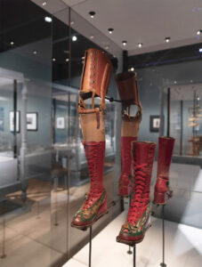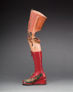 Prosthetic leg with leather boot. Appliqued silk with embroidered Chinese motifs. Photograph Javier Hinojosa. Museo Frida Kahlo. ©Diego Riviera and Frida Kahlo Archives, Banco de México, Fiduciary of the Trust of the Diego Riviera and Frida Kahlo Museums