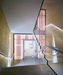 특히 2018년 완공된 가장 높은 건물 ‘토레(Torre)’는 프라다의 소장품을 보여주는 공간으로, 60m 높이의 흰색 노출 콘크리트로 제작됐다. 타워의 각 층은 카스텐 횔러, 데미언 허스트, 제프 쿤스, 모나 하툼, 마이클 하이저, 존 발데사리 등 국제적으로 명성있는 작가들의 작품들을 소개하고 있다. 공간 내부는 불투명 재질, 알루미늄, 유리 소재로 반사되어 공간감을 확장시킨다. 통유리로 설치된 건물 한쪽 면은 실내외 공간의 경계를 없애고 밀라노 시내의 전경을 내부 공간과 연결한다. 계단을 올라가는 핑크색과 회색으로 이루어진 실내 공간 재질은 관람객들에게 프라다의 아이덴티티를 보여주며 새로운 시각적 경험을 제공한다.