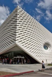 보통 LA를 할리우드 도시로 생각하게 했다면 이젠 자타가 공인 할 정도로 서부에선 매우 중요한 미술의 도시가 됐다. 그 방점을 또 하나 찍게 한 것이 있다면 2015년 개관한 억만장자 엘리 브로드 부부가 만든 더 브로드(The Broad) 뮤지엄이다. 약 1500억원을 들여 지은 이 건축은 딜로 & 스콜피오가 디자인하였고 그들의 현대미술 콜렉션 2000점 정도를 소장하고 있다. 미국 최고 작가들인 신디 셔먼, 에드 러샤, 제프 쿤스, 앤디 워홀 등의 작품과 더불어 21세기 최고의 블루칩 콜렉션이 있다고 생각하면 좋을 것 같다. 이 뮤지엄은 바로 옆에 있는 프랑크 게리 건축가가 디자인한 월트 디즈니 음악당과 나란히, LA 다운타운을 매우 중요한 문화적 메카로 자리 잡게 하는 큰 역할을 하였다.