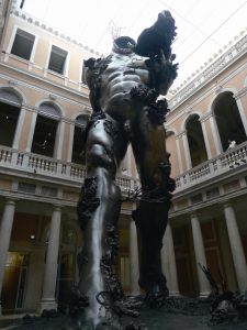팔라조 그라시 입구에 설치되어 있는 대형 작품으로 높이가 19m나 되는 청동처럼 보이는 조각. 하지만 레진으로 만들어 청동 조각과 같은 페인팅으로 마무리한 것이다. 데미안 허스트, 볼을 들고 있는 데몬, 채색된 레진, 1822x789x1144㎝ / ©이지윤 제공
