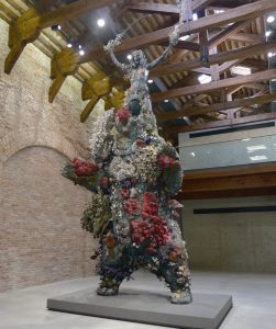팔라조 그라시 입구에 설치되어 있는 대형 작품으로 높이가 19m나 되는 청동처럼 보이는 조각. 하지만 레진으로 만들어 청동 조각과 같은 페인팅으로 마무리한 것이다. 데미안 허스트, 볼을 들고 있는 데몬, 채색된 레진, 1822x789x1144㎝ / ©이지윤 제공