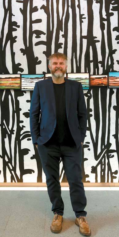 그는 정선으로 오면서 차 안에서 바라본 한국의 산세와 풍경도 작품으로 만들었다. 스마트폰으로 사진을 찍고 이것을 다시 목판화로 간결하게 찍어낸 것. 그래서 리조트의 바람벽은 자작나무 숲의 흑백의 미학과 강원도 가을의 화려함이 절묘하게 오버랩된다. 우즈는 “원경과 근경을 병치시킨 것이 이번 작품의 핵심”이라며 “상반되는 모순의 미학이 그 속에 있다”고 덧붙였다.