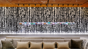 1, 2 정선의 자작나무에서 영감은 얻었다는 리차드 우즈의 작품 ‘실버 버치’가 파크로쉬 리조트 & 웰니스 로비의 벽면을 가득 채우고 있다 3 루프탑에는 자갈을 패턴화한 작품이 덧입혀졌다 4 플라잉 요가 시범을 보이고 있는 트레이너. 다양한 웰니스 시설을 갖추고 있다.