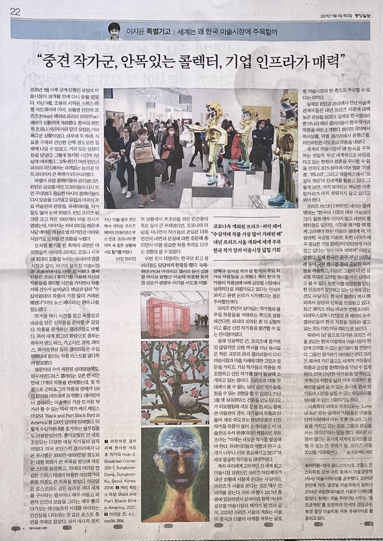 사회학자 피에르 부르디유는 ‘Love of Art’ 라는 글에서 “사람들은 미술을 단지 사랑해서 사는 것 뿐 아니라, 그 미술을 가지고 있는 동료 그룹의 관심을 사는 것이다”라는 말을 했다. 새로운 시장이 열리는 동시에 세계에 K아트를 알릴 수 있는 큰 무대가 될, 프리즈 서울 2022를 기대해본다.