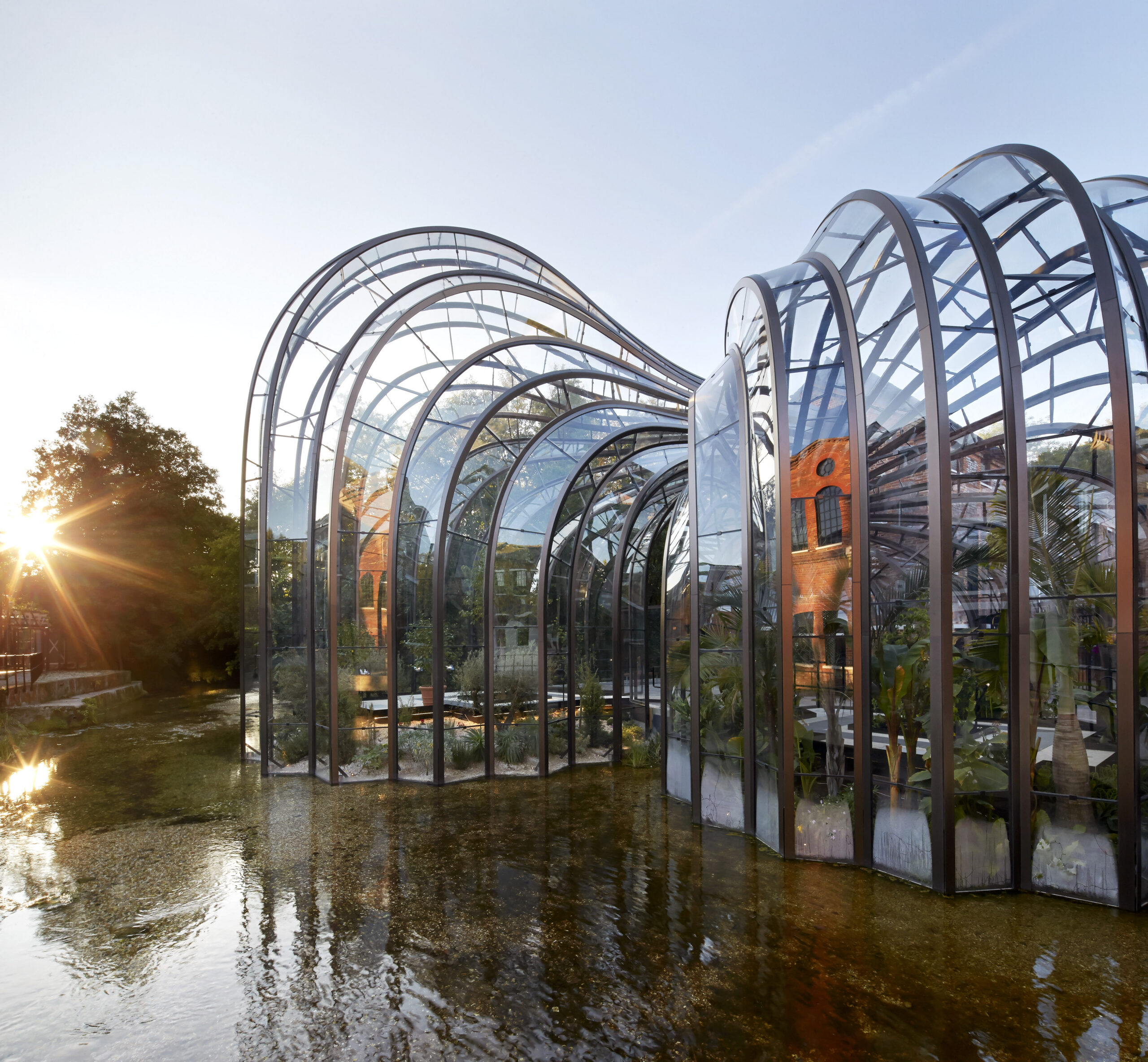 켄 리빙스턴 시장 시절, 토머스가 런던 워털루 브리지 옆에 나란히 가는 가든 브리지를 디자인한 적 있어요. 그 브리지에 코리아 가든을 만들고 싶다고 연락을 해왔죠. 결국 현실화되진 못했지만 함께 펀드 레이싱을 뛰며 우정을 쌓았어요. 그리고 제가 국립현대미술관을 떠나 다시 런던으로 돌아갔을 때 삼성전자가 ‘콜 드롭스 야드(Coal Drops Yard)’에 플래그십 스토어를 열면서 미디어 전시를 기획하게 되었는데, 거기서 또 그를 만났죠. 1800년대 석탄 저장고를 개조한 문화 예술 공간인데 토마스는 그곳의 상징물 ‘키싱 루프(Kissing Roof)’를 만들었습니다. 남아 있던 긴 건물의 지붕 두 개를 연결한 굉장히 특이한 구조의 공간이죠. 이번 전시에서도 볼 수 있어요.