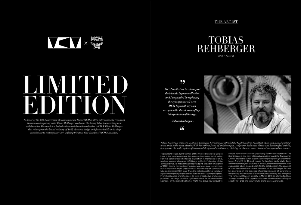 2009년 베니스 비엔날레에서 황금사자상을 수상한 토비아스 레베르거는 최근 가장 주목받고 있는 독일 아티스트이다. 그는 이번 컬래버레이션을 위해 뮌헨의 전성기였던 1970년대와 80년대에 MCM 가방을 들고 다니던 시크하고 용감한 여성들의 모습에서 영감을 받았다. 이런 대담한 정신을 매치시키기 위해 토비아스는 “MCM dazzle camouflage” 그래픽 패턴을 탄생시켰다. 이 패턴은 그만의 기발한 구상으로 눈길을 사로잡는 흑백의 형태로 MCM 로고 위에 덧입혀진다. 콜렉션은 작가의 독특한 프린트를 활용해 스타일리쉬한 컨템포러리 형태로 팩에서 쇼퍼, 미니파우치에 이르기까지 다양한 제품으로 한정수량 제작되어 모던 글로벌 노마드에게 선보이게 될 예정이다. 이번 콜라보레이션을 통해 두가지 과감하고 혁신적인 제품이 탄생되었다. ‘Kira Shopper’는 도시 탐험가들에게 어울리는 시크한 쇼퍼백이다. ‘Transformer Clutch’는 2D에서 3D로 변형되는 현대적인 디자인을 가진 접을 수 있는 클러치백으로 화려한 파티 스타일을 연출할 수 있다. 해당 제품은 한정수량 제작되어 판매될 예정이다. 형태의 변형은 그의 예술의 중심 주제다. 토비아스는 인식과 감지의 과정, 시간성과 일시적 감각, 단절과 불명확성에 대해 관찰한다. 해당 콜렉션은 2016년 3월, S/S 2016 캡슐 콜렉션 한정판으로 출시되며 국내외 일부 MCM 매장과 명품 매장에서 만나볼 수 있다.