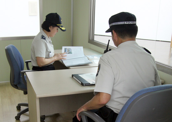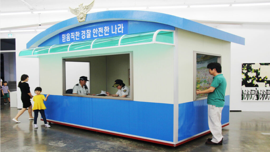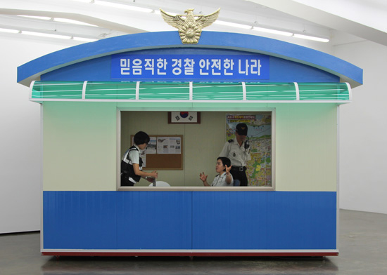 Artclub1563, the venue for Hong’s current exhibition, does itself become the object of the artist’s interrogation of public institution’s ambiguous status within the fluctuating dynamics of contemporary life. The artist seeks to express an emerging type of place that exists somewhere in between art and everyday life. This temporary place is one where invisible features of public space is brought to the surface at the same time as an artistic imagination is seen to work on the hierarchies of established orders. Young In Hong further instigates an ambiguous and temporary ‘open order’, where police officers, representatives of the law, are invited to occupy a unique zone between the public space represented by the police station and the independent space of the gallery. By still fulfilling the function of communicating with the public about the artworks in the space, the officers become part of a move to create a temporary place between the ‘free’ space and regulated public space. In this way the audience are also participants in an open experiment. The exhibition sets up a potential where the future society ‘to come’ remains undetermined and open to negotiation. Without involving normal political commentary, Hong is still redefining ‘democratic principles’ beyond the limited idea of the legal subject.