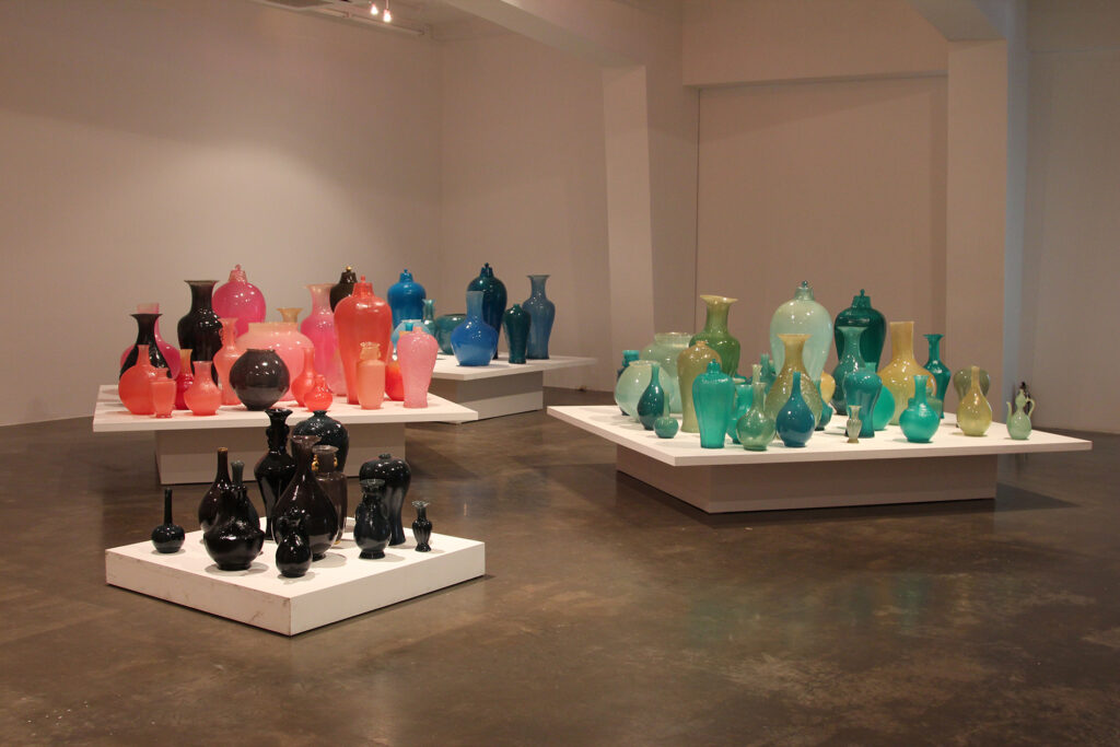 The four coloured porcelain bottles are made from the mould Shin created and sculpted afterwards. Through recreation, the artist not only found new aesthetics and interpretation, but has gone a step further to examine the spirit of the many artists who created the original works of her models.
