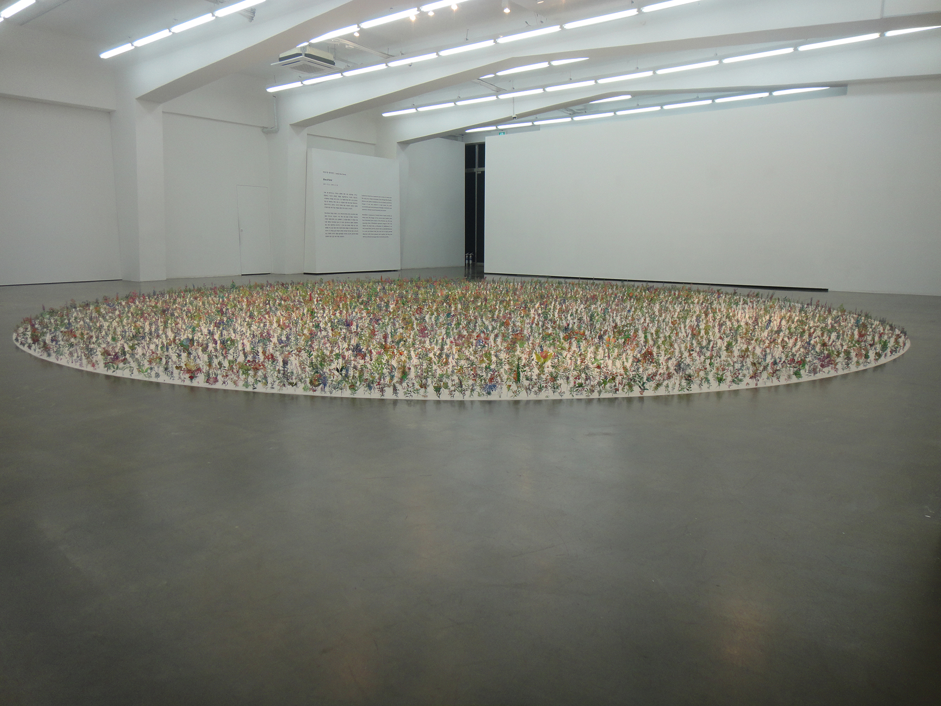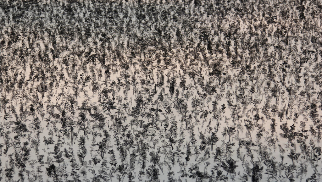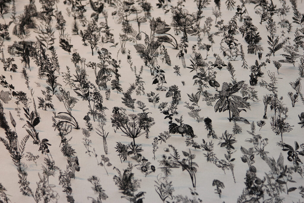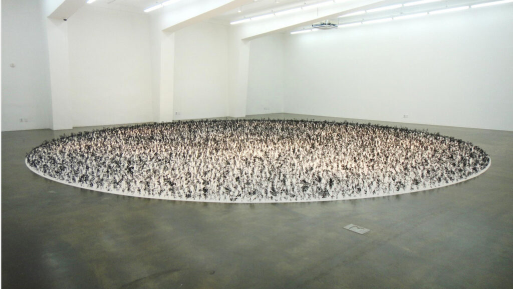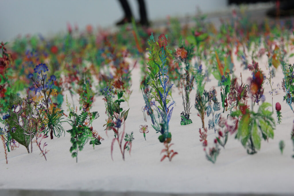 Blackfield is composed of 20,000 plant models of different kinds on the white sand. The images of the various plant models are from illustrated plant books from the Victorian era. Two opposite sides of Blackfield represents the images of ‘life’ and ‘death’: The black side as the silhouette of wildflowers on the very large field of ash, and the colorful side as the splendid flowers on a large field. Not only does his works provide observers with visual pleasure and surprise, but they also deliver profound messages about humanity and life.